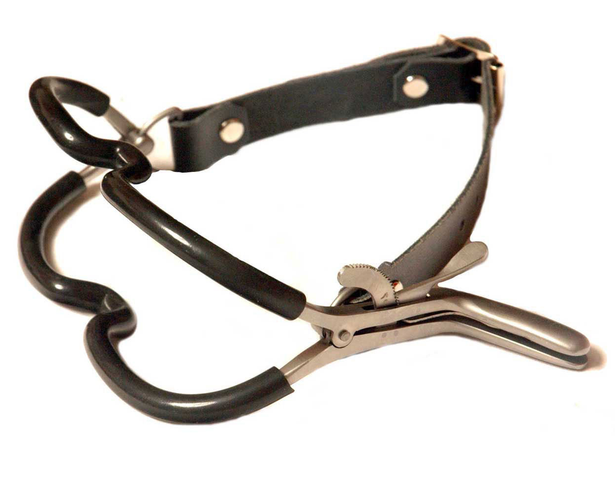 Rubber coated Whitehead mouth gag with leather belt